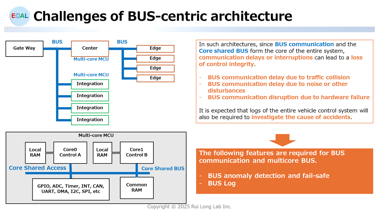 In such an architecture, as shown in the figure below, the bus communication and core common bus form the backbone of the entire system. Consequently, communication delays or interruptions can lead to a loss of control integrity. Furthermore, it is anticipated that logs covering the entire vehicle control system will be required for accident cause investigations.