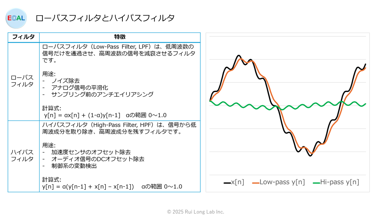 計算式: y[n] = α(y[n-1] + x[n] – x[n-1]) αの範囲 0~1.0